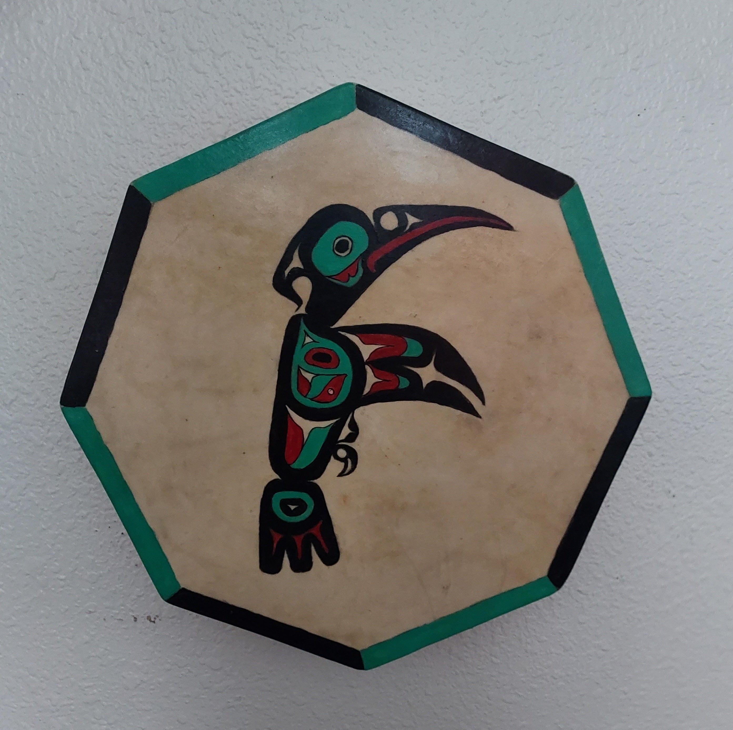 Hummingbird formline design and painted with acrylic paint on a 8 siided hand made hoop drum.